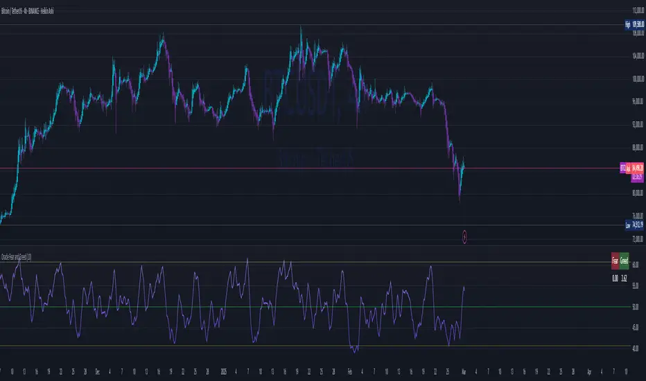 This indicator provides a unique perspective on market sentiment by calculating a custom fear/greed oscillator based on Heikin-Ashi candles. The oscillator is centered at 50, with values above 50 suggesting bullish sentiment ("greed") and below 50 indicating bearish sentiment ("fear"). The calculation incorporates candle body size, range, and a custom "candle strength" measure, providing an innovative approach to understanding market behavior.