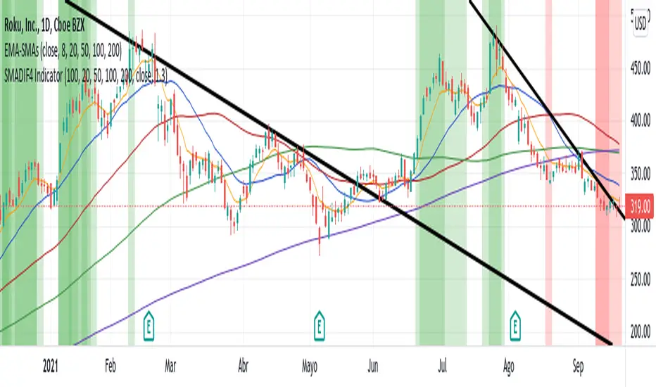 It shows a percentage difference between close and 4-SMA, 20, 50, 100 and 200. As it turns greener, the stock is more expensive, and vice versa, it turns redder when it becomes cheaper relative to the SMA. It will print the green backgraound as long as the bar closes above the 200 SMA and red as long as the bar closes below the 200 SMA. It uses by default 1.3 sigma to discriminate non-representative values and 100 bars in the past.