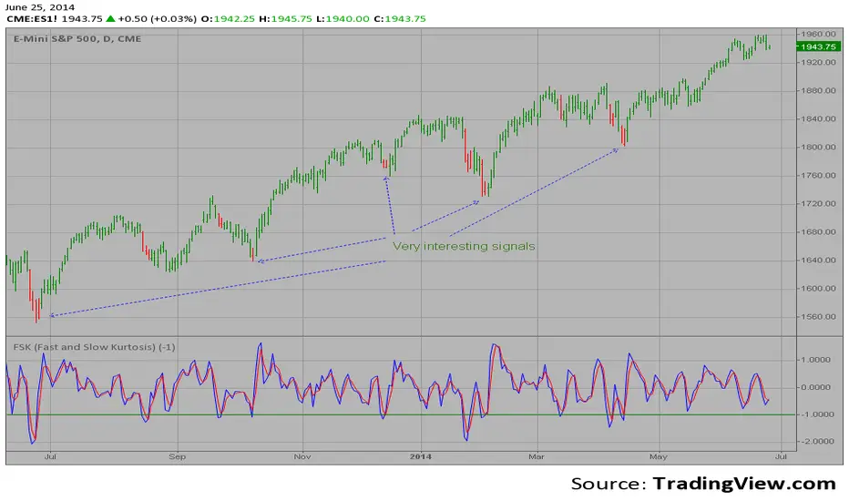 The Kurtosis, the Fast Kurtosis(FK), and the Fast/Slow Kurtosis(FSK). Signal for buy generated when indicator move up above BuyZone parameter.
