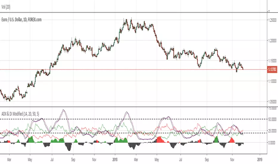 An EMA is applied to the ADX in order to catch the exhaustion of a trend (i.e. ADX line crossunder EMAADX line) or the possible formation of a new one. In the first case, we would wait a confirmation signal, which happens when the crossunder has a value greater then 50. A new trend is created when the difference between the ADX and the EMAADX is positive, with ADX greater then 20. As confirmation, we would have the DI+ greater then 20 e the DI- smaller then 20 (this would trigger a bullish sentiment, bearish for the opposite), consequently the histogram will be display in green (red in the bearish case).
