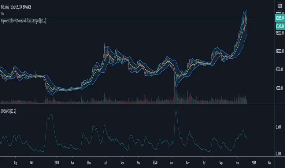 This indicator is a compliment to Exponential Deviation Bands. It is the difference between the upper and the lower bands divided by the middle band. It is an easy way to visualize consolidation before price movements or periods of higher volatility.