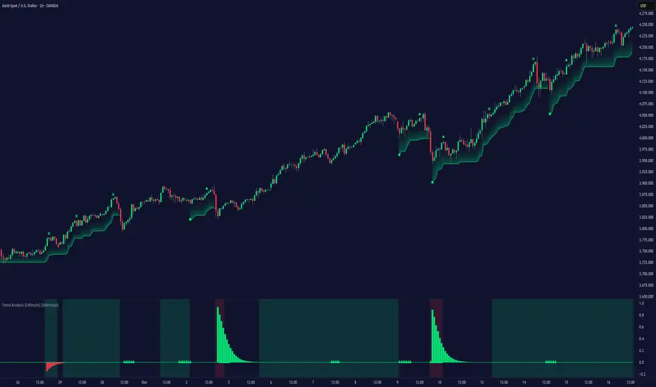 Trend Analysis Ultimate (Zeiierman) highlights meaningful pullbacks within active market trends and visualizes them through green and red columns, retracement triangles, and an optional trend-colored background. It is designed to make the distinction between continuation and transition phases clear at a glance while automatically managing dynamic trailing stops, early and partial profit-taking levels, and alert conditions for entries, take-profits, and full exits.