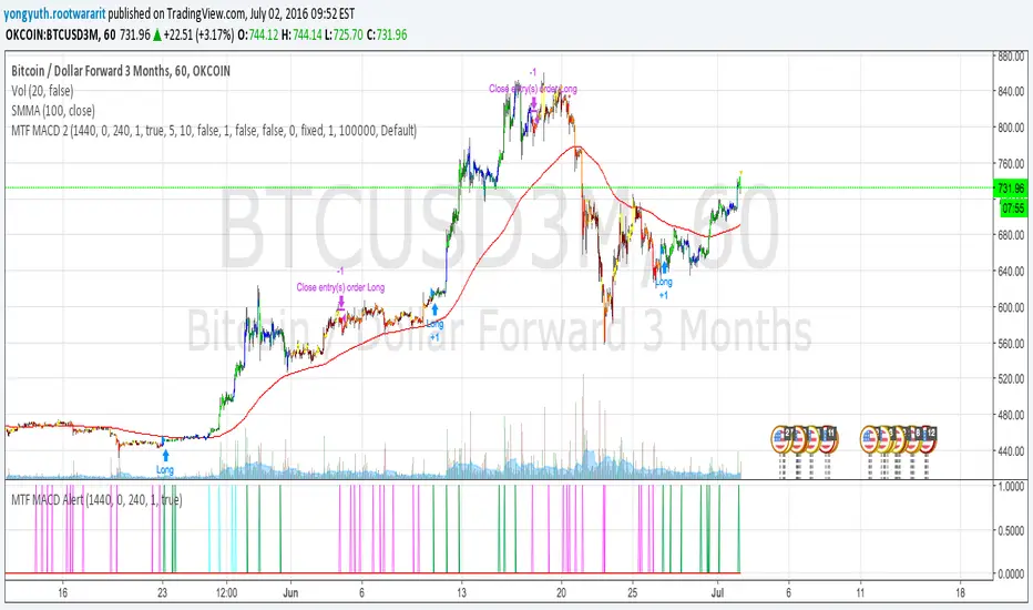 It uses multiple time frame MACD for trading decision. To avoid repaint, set the delay period = 1 for both long term and midterm.