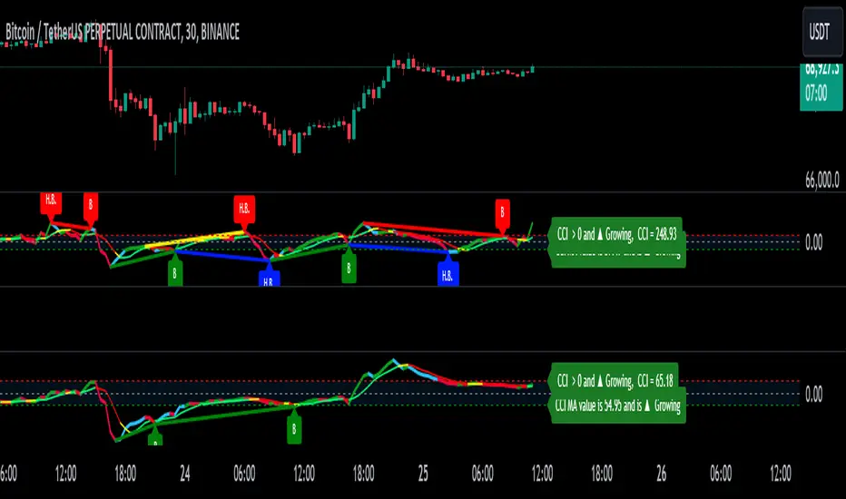 The CCI Moving average and the CCI signal are both color coded as follow: