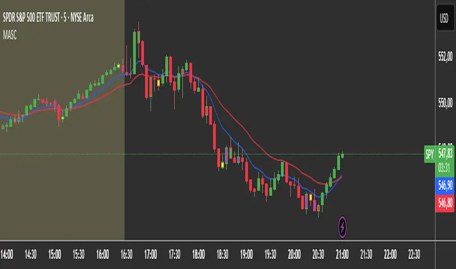 The "2 MA + Strat Candle Colors" indicator combines two customizable moving averages (MAs) with a strategic candle-coloring system to help traders analyze trends and price action. Here’s a breakdown of its features: