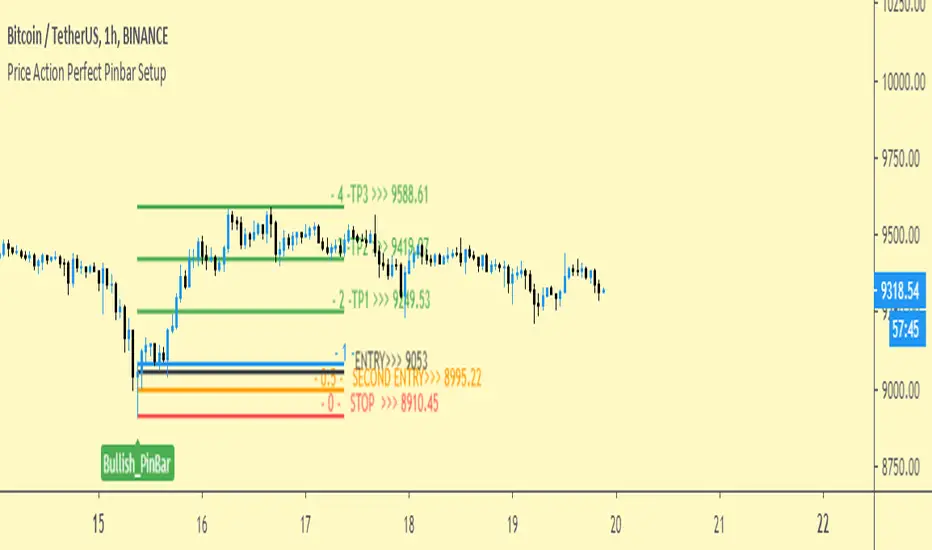 2- After fin bar detected . indicator measure the entire length of the pin bar , from the lowest to its highest point and draw auto fibo .So You can see entries ,stop and targets.