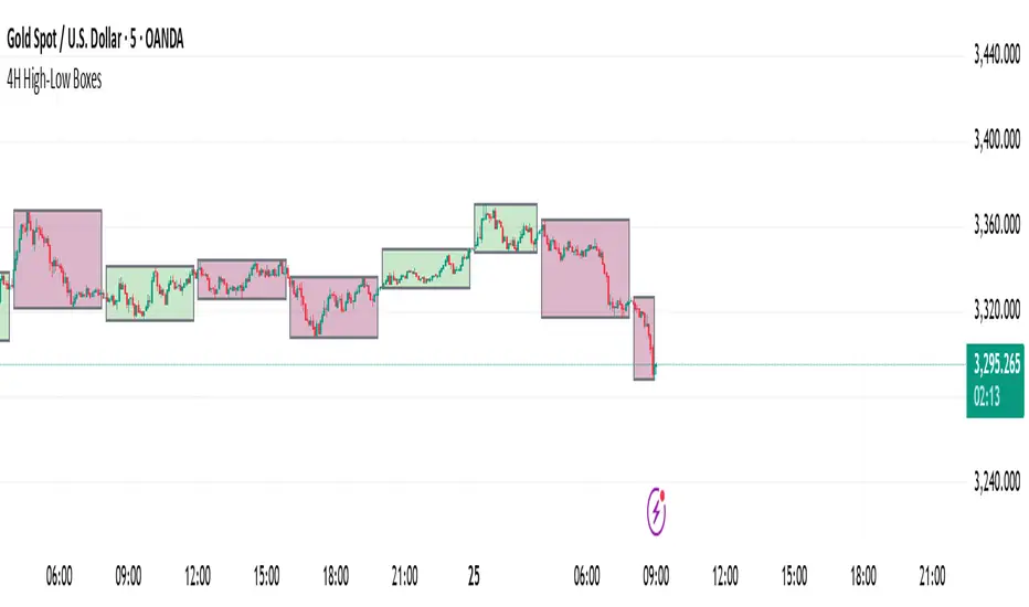 This indicator dynamically plots high-low boxes based on the most recent 4-hour candle, providing visual markers for key price levels and trends. The box is updated in real-time to reflect the highest and lowest points of the current 4-hour candle, and its color changes based on the market's direction.