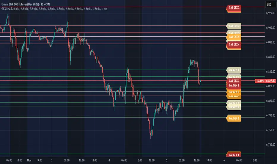 This indicator plots horizontal levels based on batched GEX levels for ESZ2025/MESZ2025. The batched data is derived from contracts expiring: 0DTE, 1DTE, EoW, EoM, Next Week, Next Month and 3-months out. Labels are available for a high-level view of which levels are which. Hovering (or long-pressing on mobile TV) over the labels will display the nominal values and Rank. This script is manually updated and may not be always updated.
