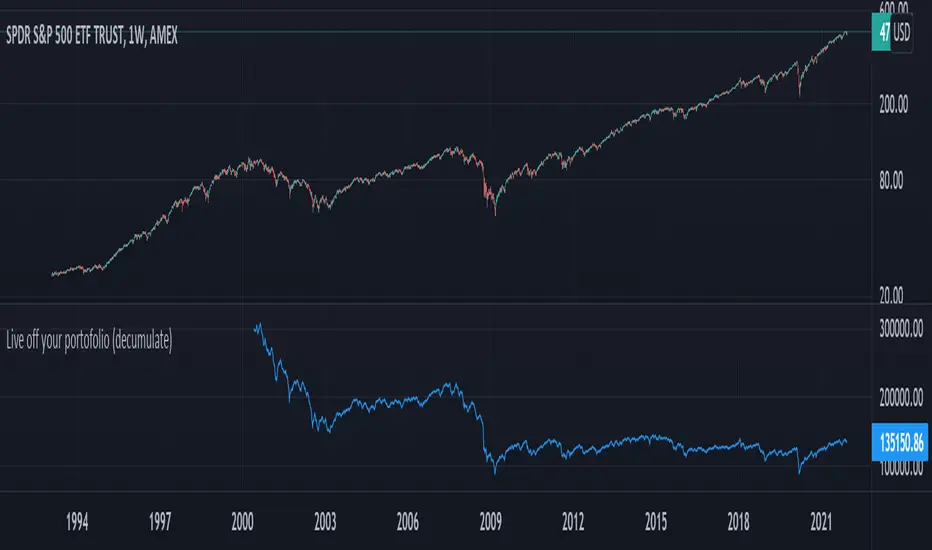 This indicator simulates living off your portofolio consisting of a single security or stock such as the SPY etf or even Bitcoin. The simulation starts at a certain point on the chart (which you input as year and month).