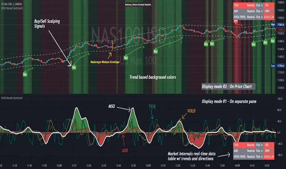 By default, this indicator comes with two day trading strategies and offers long and short signals with alerts. These strategies attempts to leverage on the oscillating nature of market price movement on major NYSE indices, such as SPY, SPX, QQQ, NAS, all of which have high correlation with the market internals. However, please note that these signals offers no guarantee to profitability, so use at your own risk.