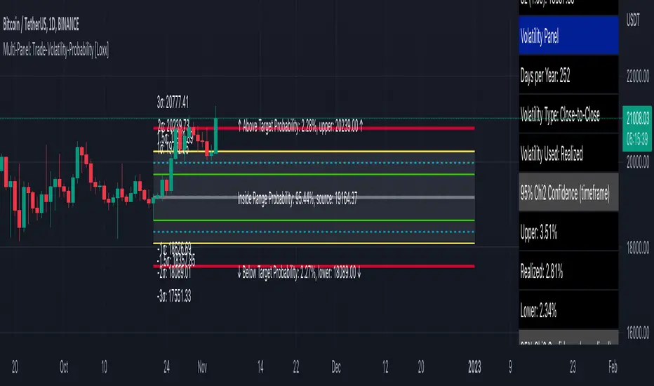 Multi-Panel: Trade-Volatility-Probability [Loxx] shows user selected and volatility-based price levels and probabilities on the chart. This is useful for both options and all styles of up/down trading methods that rely on volatility.