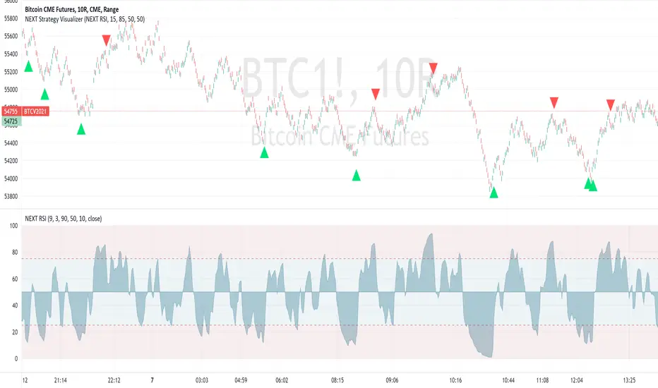 NEXT RSI Plot is fully compatible as a Signal Source for NEXT Strategy Visualizer, a visual strategy builder, intended primarily for discretionary trading.Below: NEXT RSI (Length 9, P/V Weighing 3) overbought/oversold (contra-trend, momentum) strategy plotted on EURUSD 10-Range chart via NEXT Strategy Visualizer.