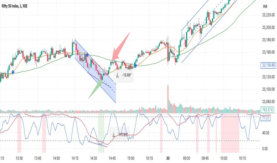 As shown in picture below, it works better when script is making a channel, Our indicator shows green or red signal, we wait for RSI Divergence and we enter. We book when blue line (9,3) goes above 80, as shown by arrow, and trail rest at breakeven or your own trailing method