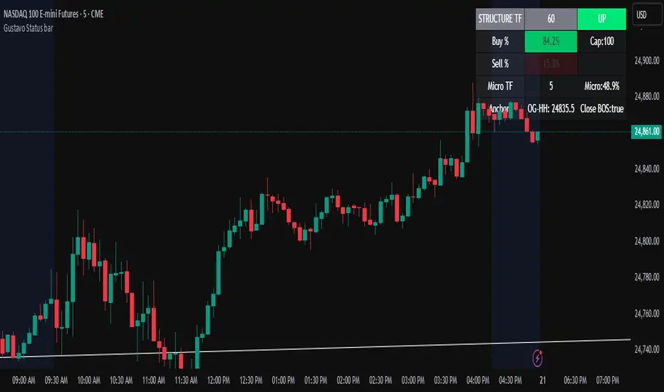 A Pine Script v6 chart overlay that shows a persistent status table with continuously updating Buy/Sell percentages, driven by 15-minute microstructure but governed (and capped) by the selected main timeframe’s market structure (default 1H) using HH/HL vs LL/LH with smooth easing.