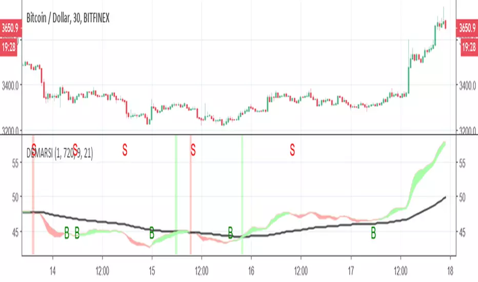 The green and red zones are also DEMA RSI that is calculated in different way (the cross between the fast and the slow moving create the color change and the signal.