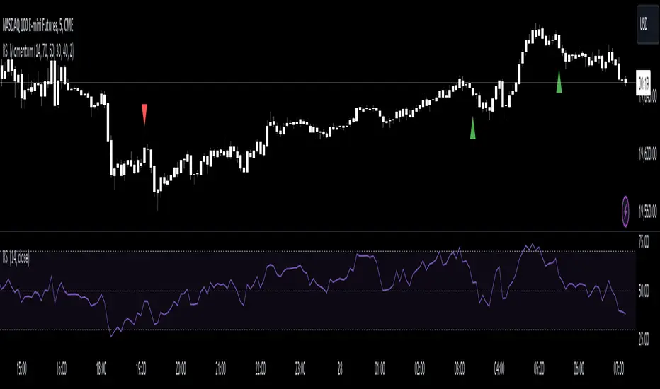 The RSI Momentum indicator generates buy and sell signals based on the Relative Strength Index (RSI) crossing specific thresholds. The Key difference is that we're using RSI overbought and oversold readings as the foundation for finding continuation signals in the same direction of that momentum. This solves the issue of trying to buy the bottom or sell the top and offsets any oscillators main weakness, divergence and false signals in a strong trend.
