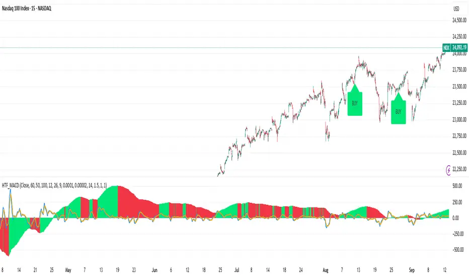 This indicator combines a higher-timeframe EMA trend filter with a MACD crossover on the chart’s timeframe. The goal is to make MACD signals more selective by checking whether they occur in the same direction as the broader trend.