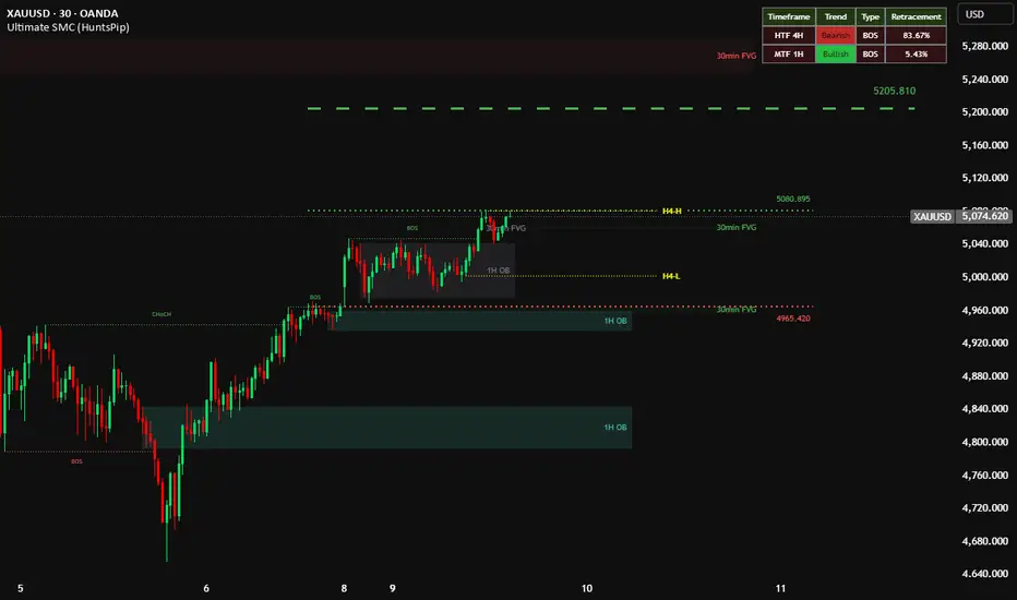 Ultimate SMC (HuntsPip) combines six Smart Money Concepts features into a single overlay: multi-timeframe market structure with BOS/CHoCH labels, order blocks, fair value gaps, premium/discount zones, time-based liquidity sweeps, and session-based liquidity sweeps - all with independent controls across three configurable timeframes. It provides a comprehensive institutional trading toolkit in one indicator, allowing traders to build fully customized multi-timeframe SMC setups where structure, supply/demand zones, imbalances, and liquidity tracking all work cohesively for maximum confluence and precision.