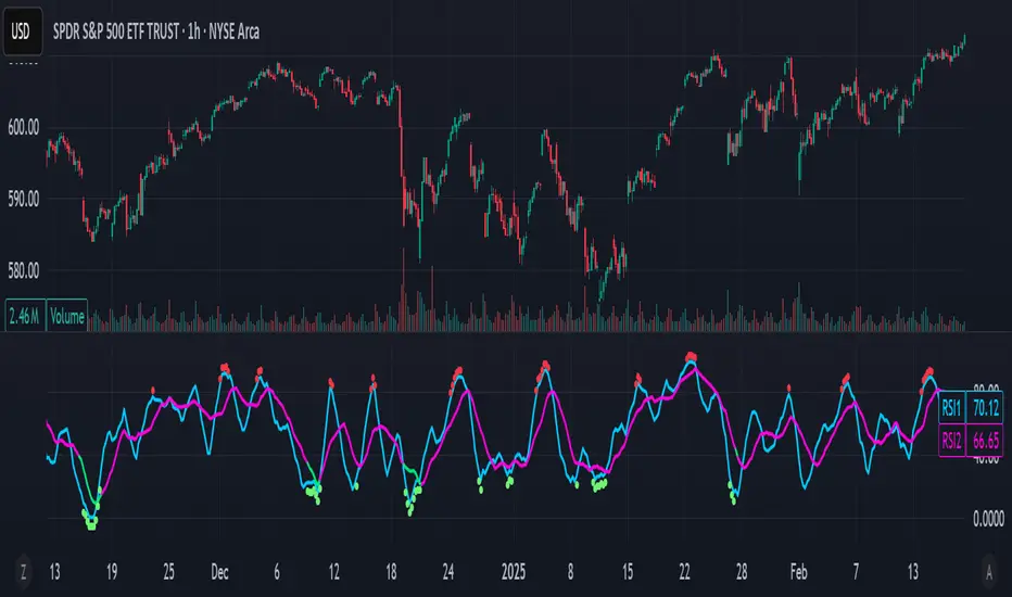 RSI Length 1 & 2: Adjusts the calculation periods for the two RSI values.