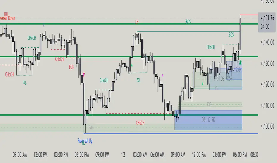 This advanced indicator combines multiple Smart Money Concepts and Inner Circle Trading methodologies to identify institutional-level market structures, order blocks, imbalances, and key reversal points on any timeframe.