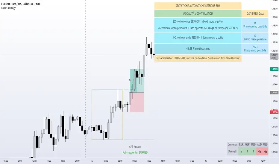 Kairos AR Edge è un indicatore closed-source (invite-only) che fornisce analisi statistica sulle rotture del box della sessione asiatica e forza relativa delle valute su 28 coppie principali. A differenza dei normali strumenti di breakout o trend-following, consolida il comportamento dei breakout in un’unica panoramica, aiutando i trader a identificare rapidamente bias direzionali e valute forti/deboli. Questa aggregazione offre insight unici non facilmente ottenibili analizzando coppie singole.
