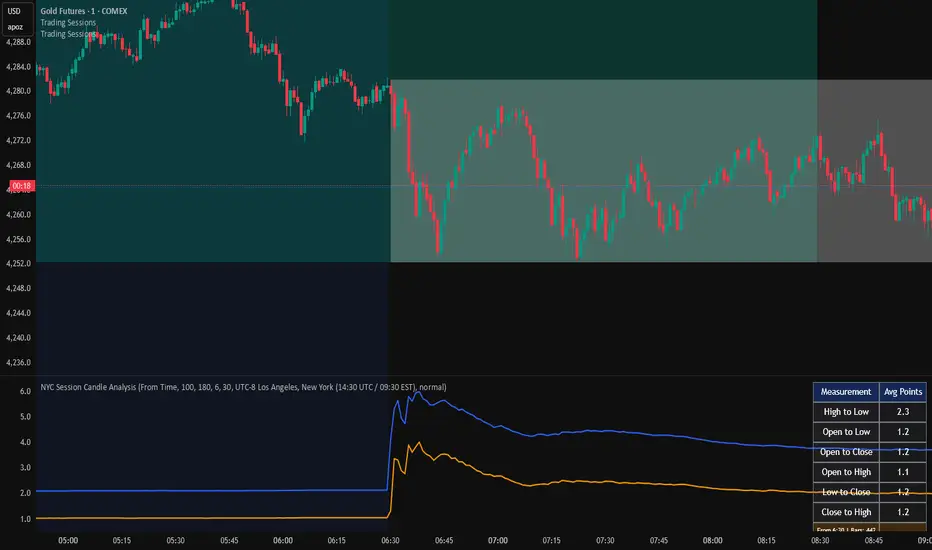 Candle Analysis is a volatility-measurement tool that calculates average candle movements starting from a selected reference point, such as a fixed number of candles, a specific time and timezone, or a major trading session like New York, London, or Tokyo. It measures multiple candle ranges including High–Low, Open–Low, Open–Close, and others, then displays the averages in both points and ticks. The indicator helps evaluate market behavior during session opens, analyze open-range volatility, and understand typical candle movement patterns across different markets and timeframes.