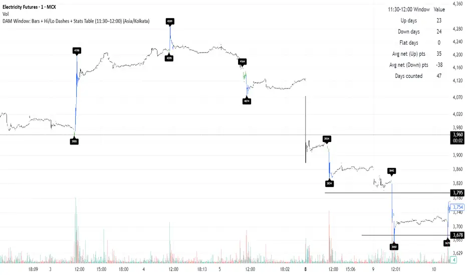 Tracks the OHLC during 11:30–12:00 window per day