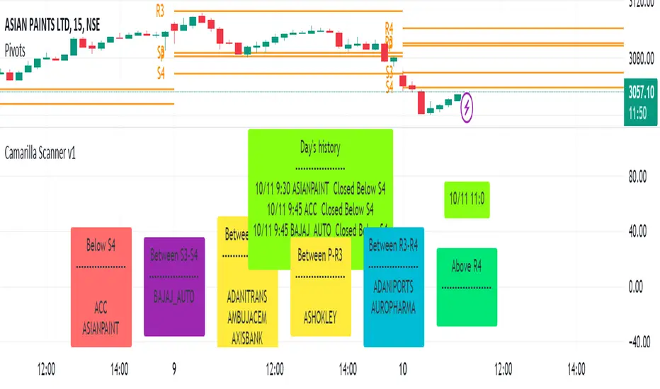 It will scan the selected stocks chosen in input settings displays the current status of where they are with respect to Camarilla pivots.