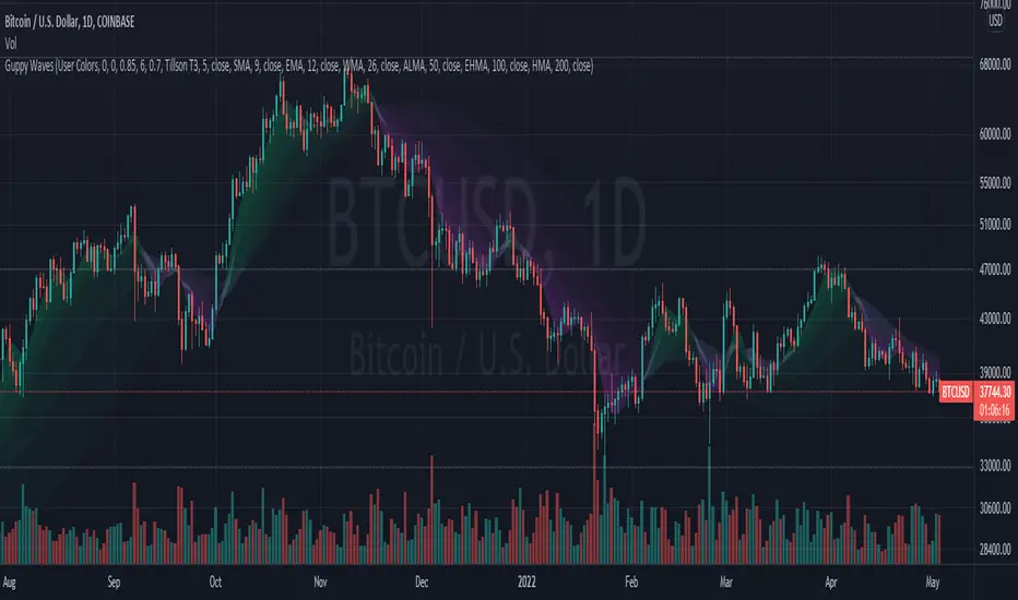 A lightweight version of the popular "Moving Average Ribbon" or "Guppy" indicators where the visuals are plotted as "waves" rather than moving average lines. As is customary for my indicators, nearly everything about it is user selectable.
