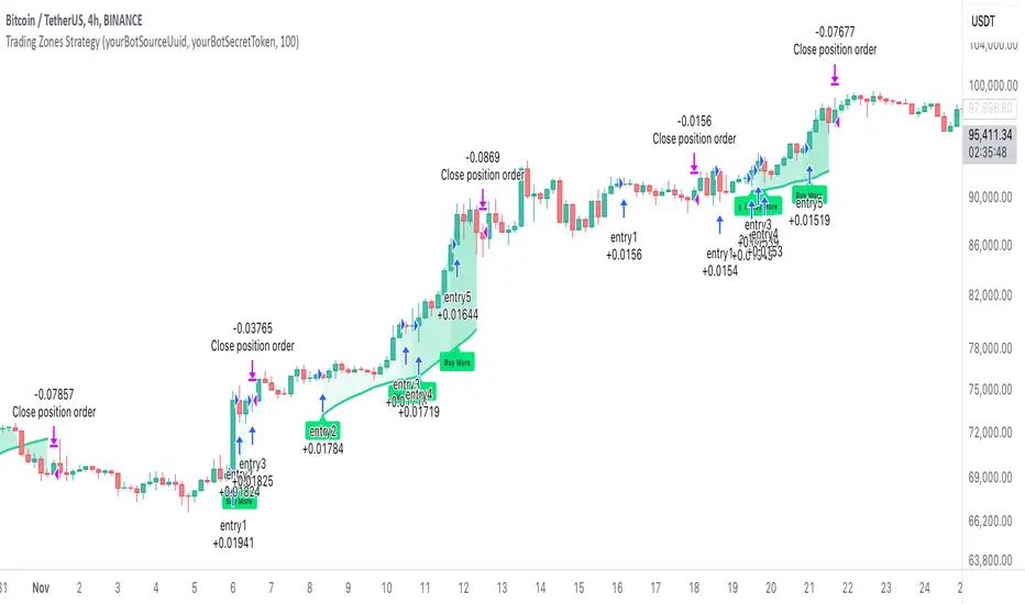 AO/AC Trading Zones Strategy [Skyrexio] leverages the combination of Awesome Oscillator (AO), Acceleration/Deceleration Indicator (AC), Williams Fractals, Williams Alligator and Exponential Moving Average (EMA) to obtain the high probability long setups. Moreover, strategy uses multi trades system, adding funds to long position if it considered that current trend has likely became stronger. Combination of AO and AC is used for creating so-called trading zones to create the signals, while Alligator and Fractal are used in conjunction as an approximation of short-term trend to filter them. At the same time EMA (default EMA's period = 100) is used as high probability long-term trend filter to open long trades only if it considers current price action as an uptrend. More information in "Methodology" and "Justification of Methodology" paragraphs. The strategy opens only long trades.