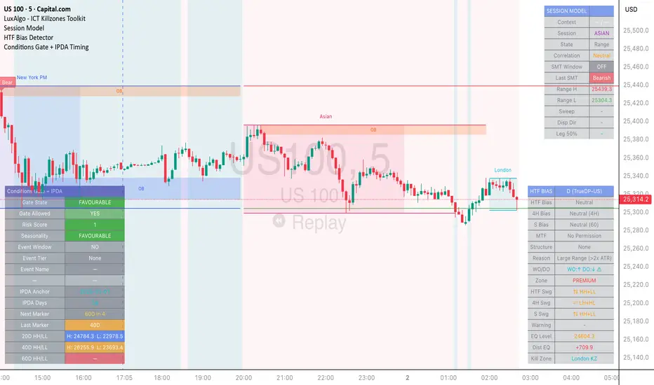Purpose: A deterministic session model indicator that identifies trading sessions (Asian, London, NY), builds range levels from specific time windows, detects price action states (Range → Sweep → Displacement → Rebalance), and tracks divergences across 3 index symbols.