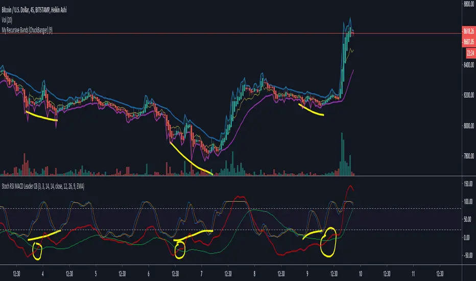 MACD leader and Stochastic RSI works well together and they are powerful in combination with My Recursive Bands. It is up to you to back test this properly before you use it in real life trades. But in my opinion it is very powerful.
