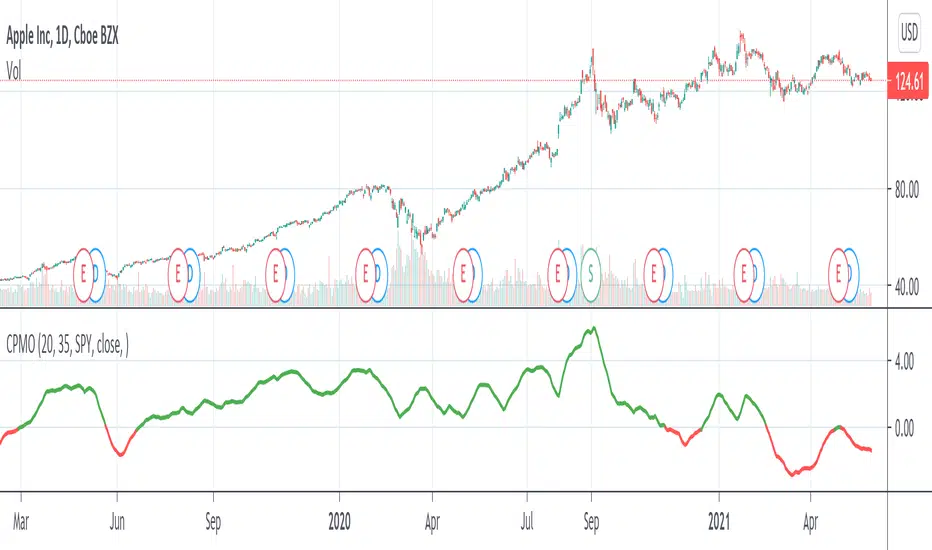 The Compare Price Momentum Oscillator was created by Vitali Apirine (Stocks and Commodities Aug 2020 pg 16) and this is a handy indicator to compare the momentum of the current symbol you are looking at to the s&p to determine the relative strength of the underlying security. Buy when the line turns green and sell when it turns red.