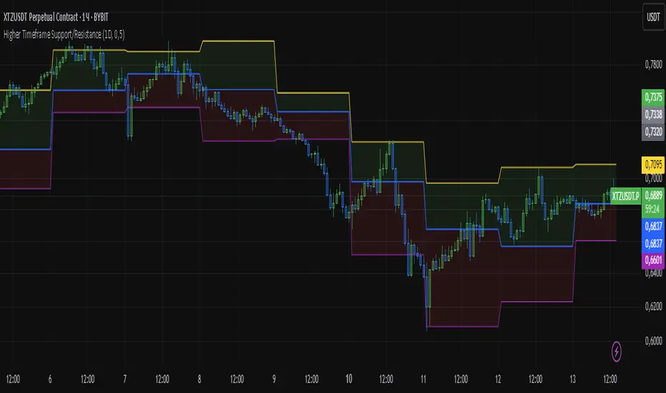This TradingView indicator helps you monitor important support and resistance levels based on the previous candle’s high, low, and close from a higher timeframe. By default, it uses a daily timeframe, but you can adjust this to any timeframe you want.