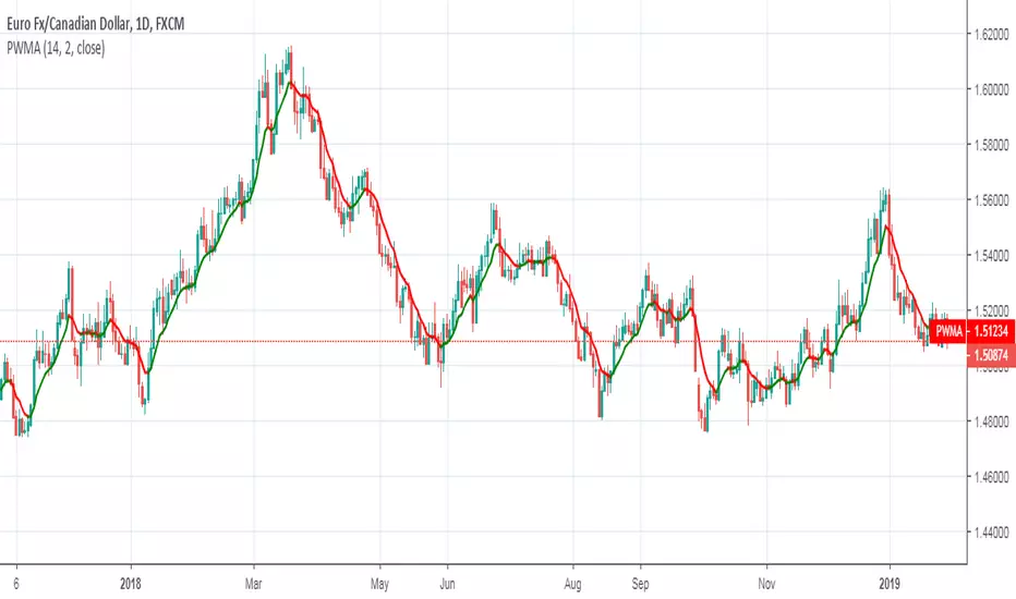 The weights of this moving average are powers of the weights of the standard weighted moving average WMA.
