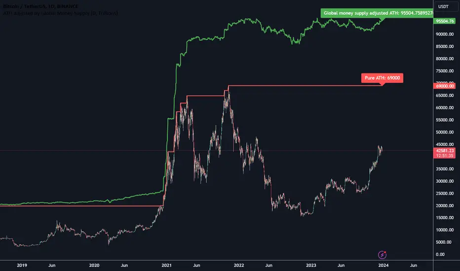 Hereby a script that calculated the ATH that is corrected by the global money supply. It shows that regular ATH (based on high daily candles) as well as the ATH that is adjusted by the global money supply index.
