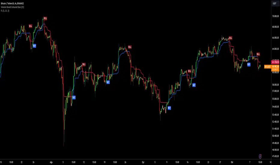 2- ATR Filter is activated in default settings and the indicator follows the trend with a distance from Highs and Lows considering ATR (default length 5) values. If you turn off the ATR filter, the indicator line only takes into account the Highs and the Lows. Indicator will get more agile but the risk of choppy signals can be taken that time. I personally advise you to increase the Bollinger Band Deviation from 1 to between 1.5-2 to stabilize the fake signals when ATR filter is turned off.