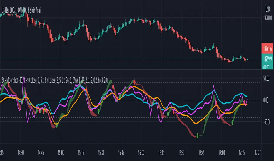 Moonshot is an indicator that encapsulates the value delivered by the TSI, MACD, Awesome Oscillator and CCI algorithms to produce signals to enable users to enter positions in ideal market conditions. Moonshot integrates the value delivered by the above four algorithms into one script.
