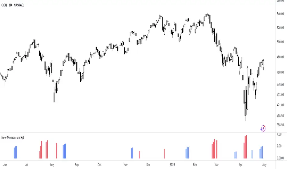 New Momentum H/L shows when momentum, defined as the rate of price change over time, exceeds the highest or lowest values observed over a user-defined period. These events shows points where momentum reaches new extremes relative to that period, and the indicator plots a column to mark each occurrence.