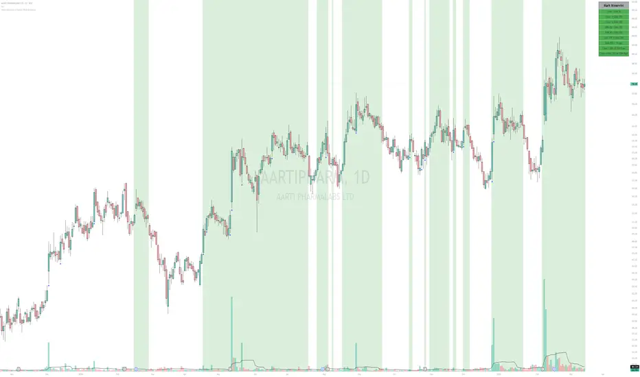 The chart background will be highlighted in a custom color whenever all of the Mark Minervini conditions are satisfied. (Adjust the transparency and color in setting)