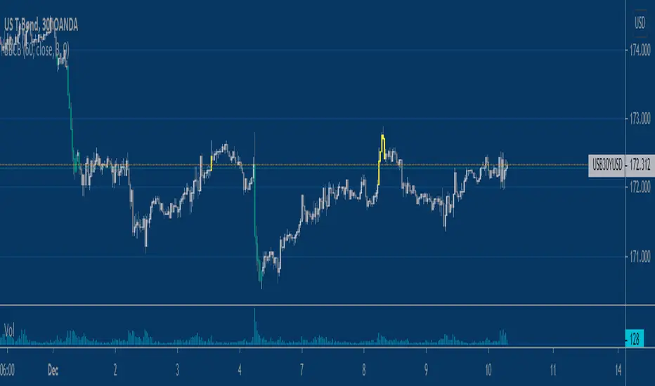This is a simple addition to the built in Bollinger Bands script. All it does is replaces the traditional plotting of Bollinger Bands with color bars.