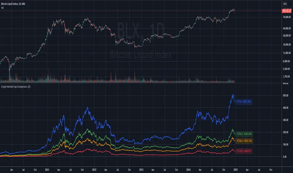 This indicator compares the performance of major cryptocurrency market cap indices: TOTAL, TOTAL2, TOTAL3, and OTHERS. It normalizes each index's performance relative to its starting value and visualizes their relative changes over time.