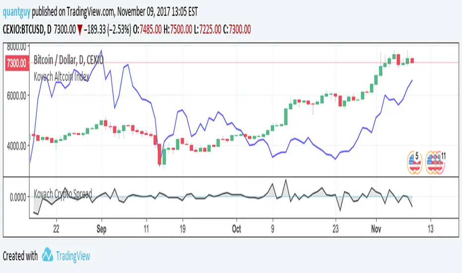 Combined with the Kovach Crypto Spread, these two indicators can help visualize asset flows from Bitcoin to Altcoins and vice versa. For example, now we have a bit of a pullback in Bitcoin due to the Segwit2x fork cancellation. We can clearly see, using the Altcoin index, that Altcoins are rallying from investors pulling out of Bitcoin.