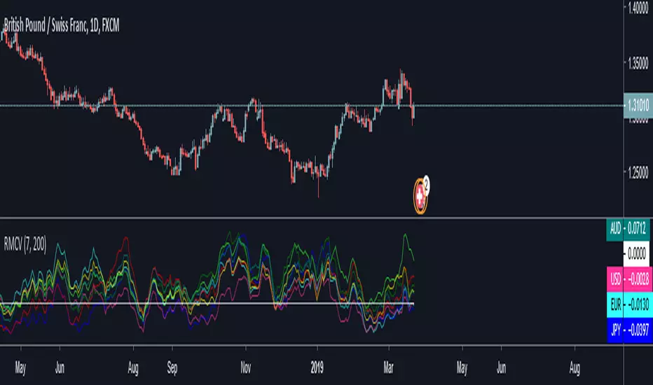 It does this by drawing volume information from all 28 major pairs. It then takes two simple moving averages, one short-term and one long-term, and compares and normalizes the difference between these two (this difference is called relative volume). These relative volumes for each pair are then averaged together to find the relative volume for the entire currency. If relative volume is greater than 0, then the currency is experiencing higher volume than average as a whole. If relative volume is less than 0, the currency as a whole is experiencing low volume.