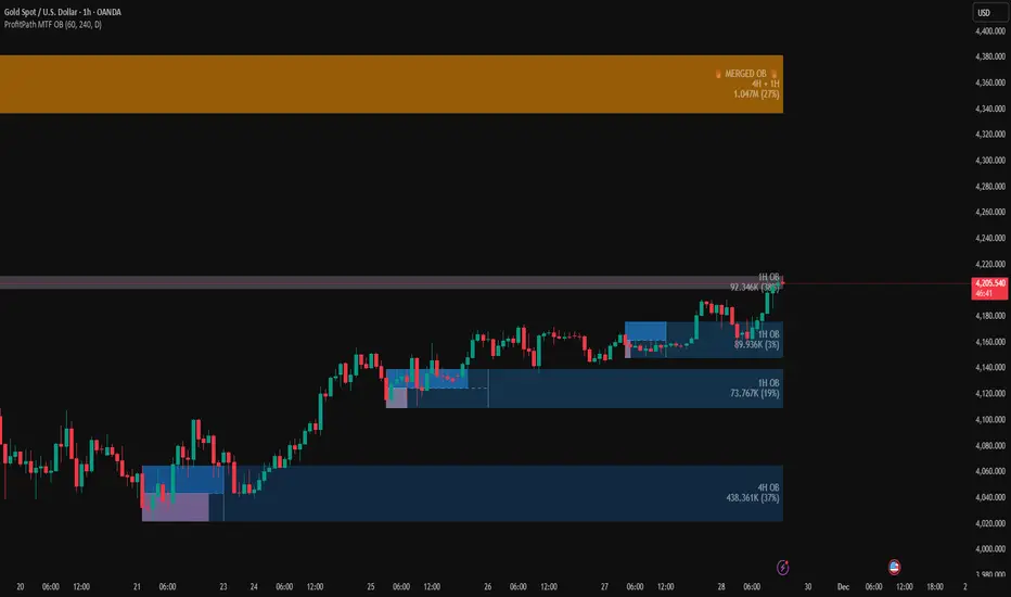 Identify high-probability trading zones with ProfitPath MTF OB – a powerful Multi-Timeframe Order Block indicator that automatically detects and merges institutional order blocks across 3 customizable timeframes.
