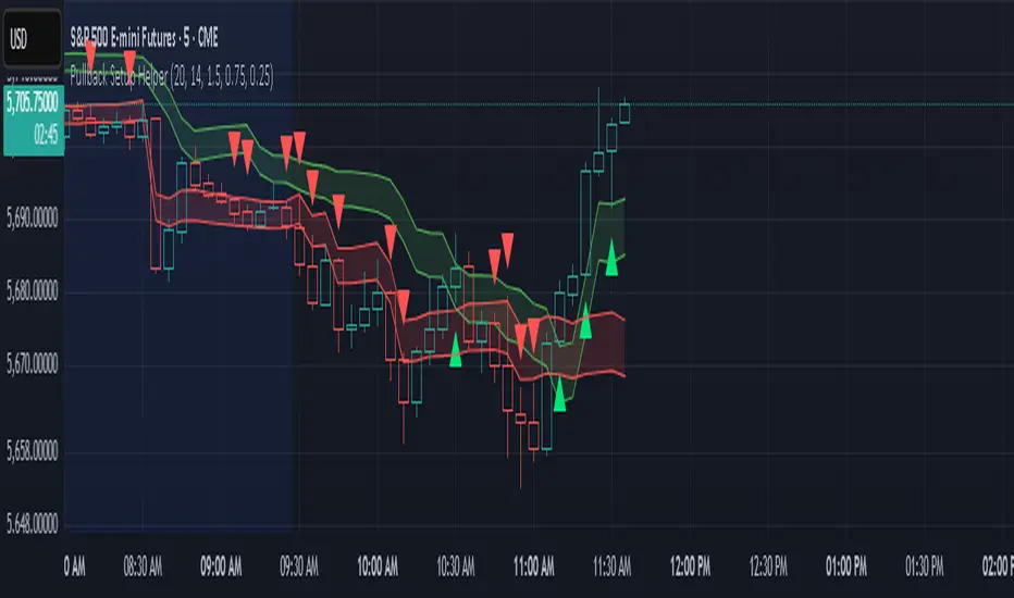 The Pullback Setup Helper is a visual tool designed to assist traders in identifying high-probability pullback entry zones in both bullish and bearish trends. It dynamically calculates support and resistance pullback areas using a combination of recent price extremes and ATR-based volatility measures.