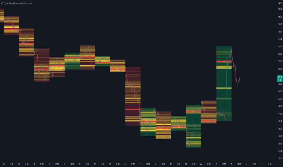 Uses higher timeframe (HTF) candles to create a heatmap of volume distribution within each candle.
