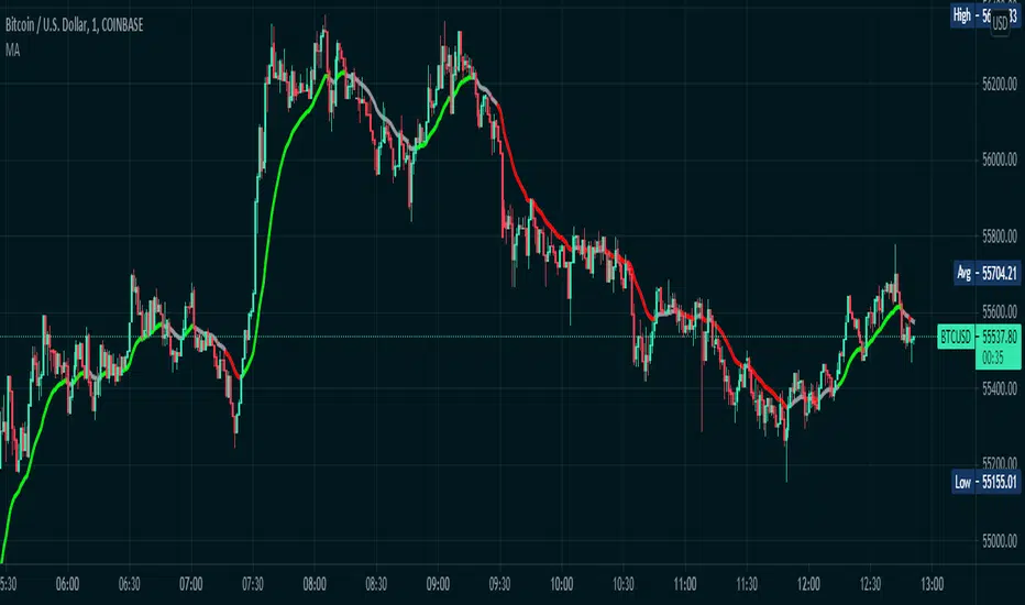Basically it's a moving average that changes colors based on the trend. How does it do it, you may ask? Simply put, it checks and makes sure that the open and close price is above the moving average, then it checks and sees if the 50-period RSI (length adjustable) is above 50. If both conditions are met, the moving average turns green. Simple as that.