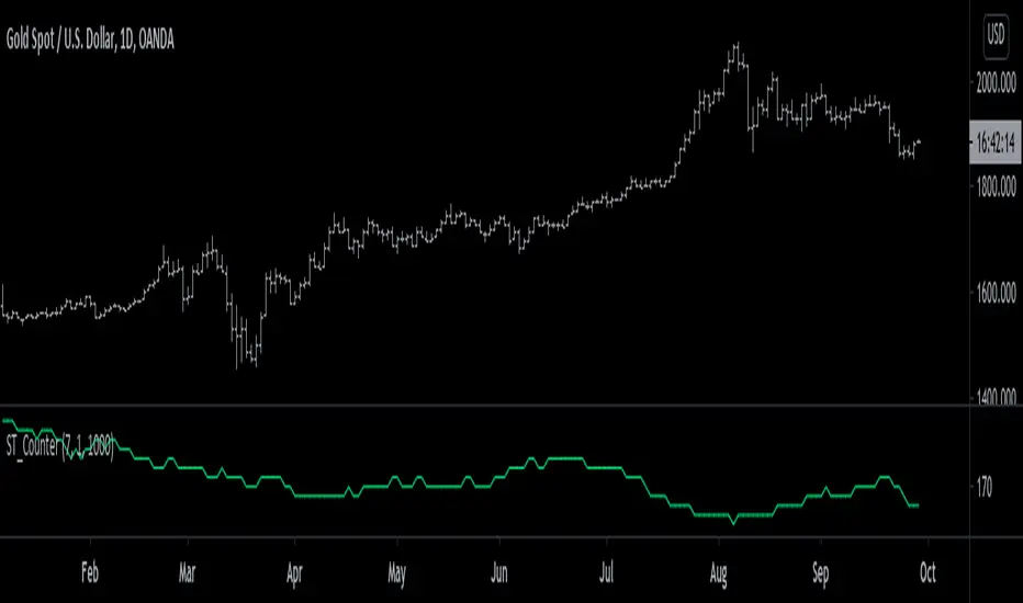 SuperTrend Counter counts the number of signals SuperTrend has produced over a defined lookback period. It may be useful if you want to backtest SuperTrend. If so, this is the perfect indicator for you. Special thanks to everget, I used part of his SuperTrend indicator. Enjoy ;)