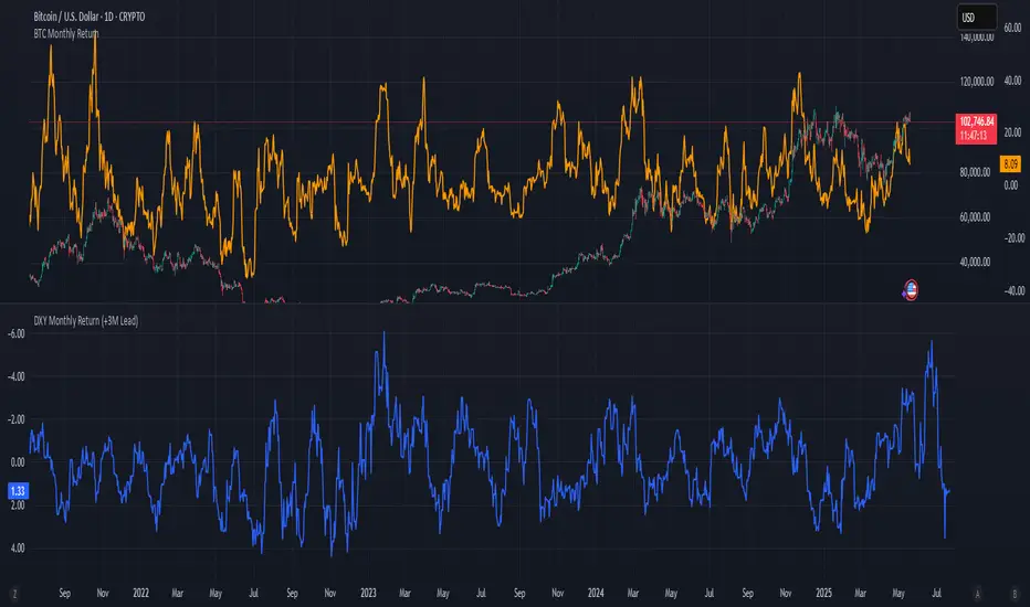 This indicator calculates the rolling monthly return (based on 21 trading days) for the U.S. Dollar Index (DXY), applying a +3-month forward shift (lead) to the series.
